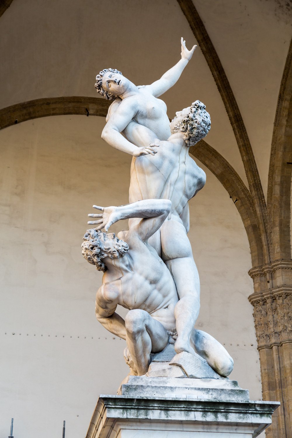 Start in the Piazza della Signoria that is home to a glorious collection of outdoor sculpture. Among them is a replica of Michelangelo’s David –- number one sculpture on any art-connoisseur’s list –- in the location it was commissioned for and Giambologna’s Rape of the Sabine Woman betwixt the Medici Lions. Enjoy how they come to life in the fresh air.