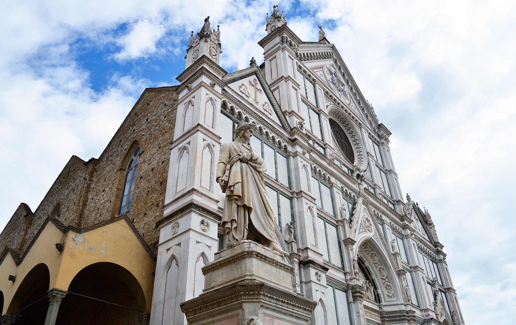 The first glimpse you’ll likely have of Santa Croce is the striking facade. While the church itself was founded in the 13th century, quite possibly by St. Francis himself, the ornate facade we see today is a 19th-century Gothic Revival design by the architect Niccolò Matas. It was built from 1857-1863, with the finishing touches complete in 1865 so as to be timed with the placement of the statue of Dante. If you’re thinking it’s a bit strange that the church didn’t have a finished facade for over 500 years, it turns out that it wasn’t an uncommon occurrence. Before the 19th century, Santa Croce had an unfinished stone facade much like the Basilica of San Lorenzo in Florence that lacks a facade even today. The impressive facade of Florence’s Duomo was also a 19th century addition. In an age of architectural revivalism, Matas’s design for Santa Croce was inspired by the great Gothic cathedrals in Siena and Orvieto. However, on Santa Croce’s facade you’ll notice a prominent Star of David at the top. There are a number of theories about the star design, but the 6-pointed star has been used in many religions including Christianity.