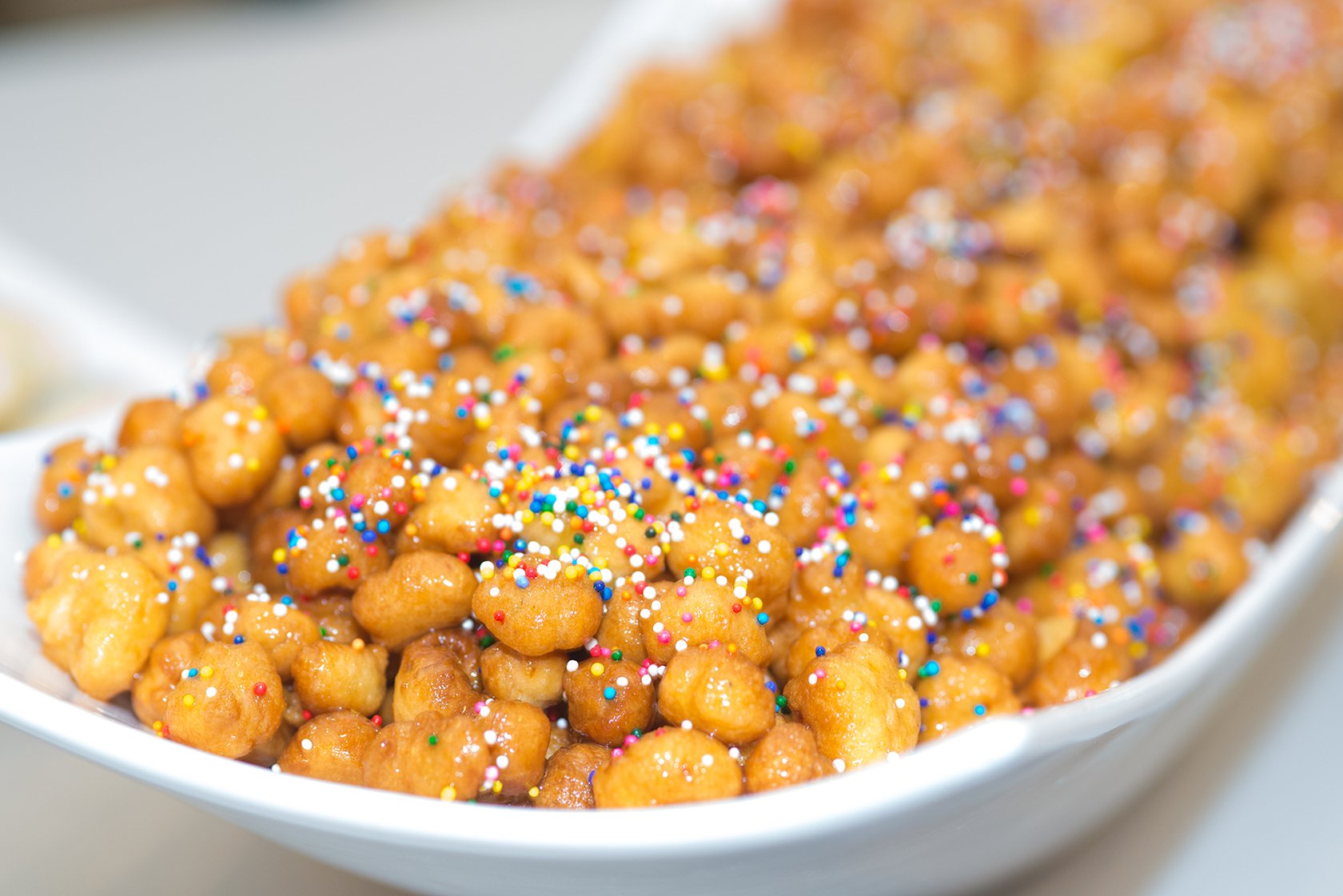 Naples is a must for foodies in Italy and the holidays are no exception – especially if you have a sweet tooth. One Christmas favorite you’ll see in bakeries are round or wreath shaped piles of golden colored struffoli. These small balls of fried sweet dough are doused in honey and often mixed with candied fruit and other sweets. Sprinkles? Perchè no! When made well, these sweet treats are a bit crunchy on the outside and light in texture. Unlike panettone and pandoro, which are quite complex to prepare, struffoli are fun and easy to make at home. Here’s a struffoli recipe to add a Neapolitan touch to your holidays. Just be prepared … it’s hard to resist having just one more!